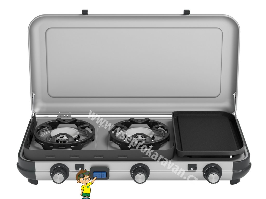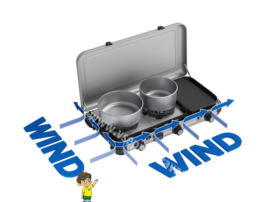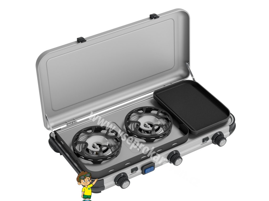 Vařič Camping Kitchen 2 Multi-Cook kombinuje vaření a grilování v jednom díky třem nezávislým hořákům, které umožňují individuální regulaci tepla. Lze současně vařit, smažit a opékat. Připravte si horké a včas servírované jídlo. I když je počasí nepředvídatelné, technologie Flame Guard hořáků je navržena pro optimální ochranu plamene pro nejlepší výsledek z vaření v přírodě. Snadno se přenáší. Díky zesíleným pantům spojujícím víko se základnou se celý vařič stává vlastním kufříkem pro čisté a rychlé sbalení před cestou i po ní. Podpěry pánví a grilovací deska jsou odnímatelné pro snadné čištění.