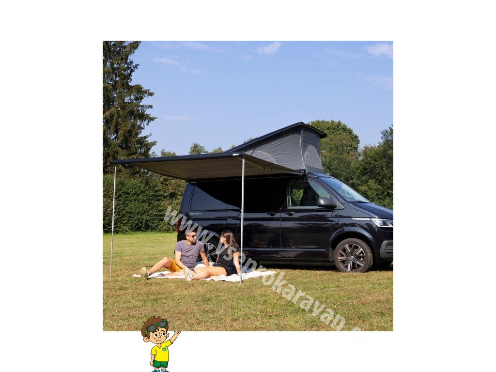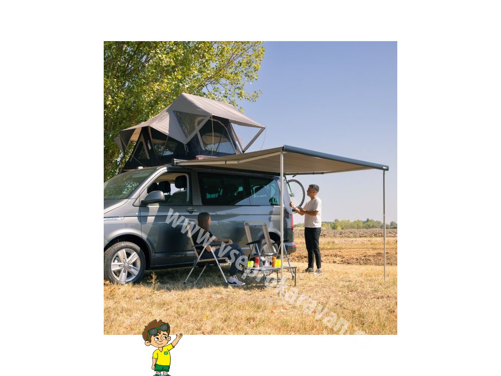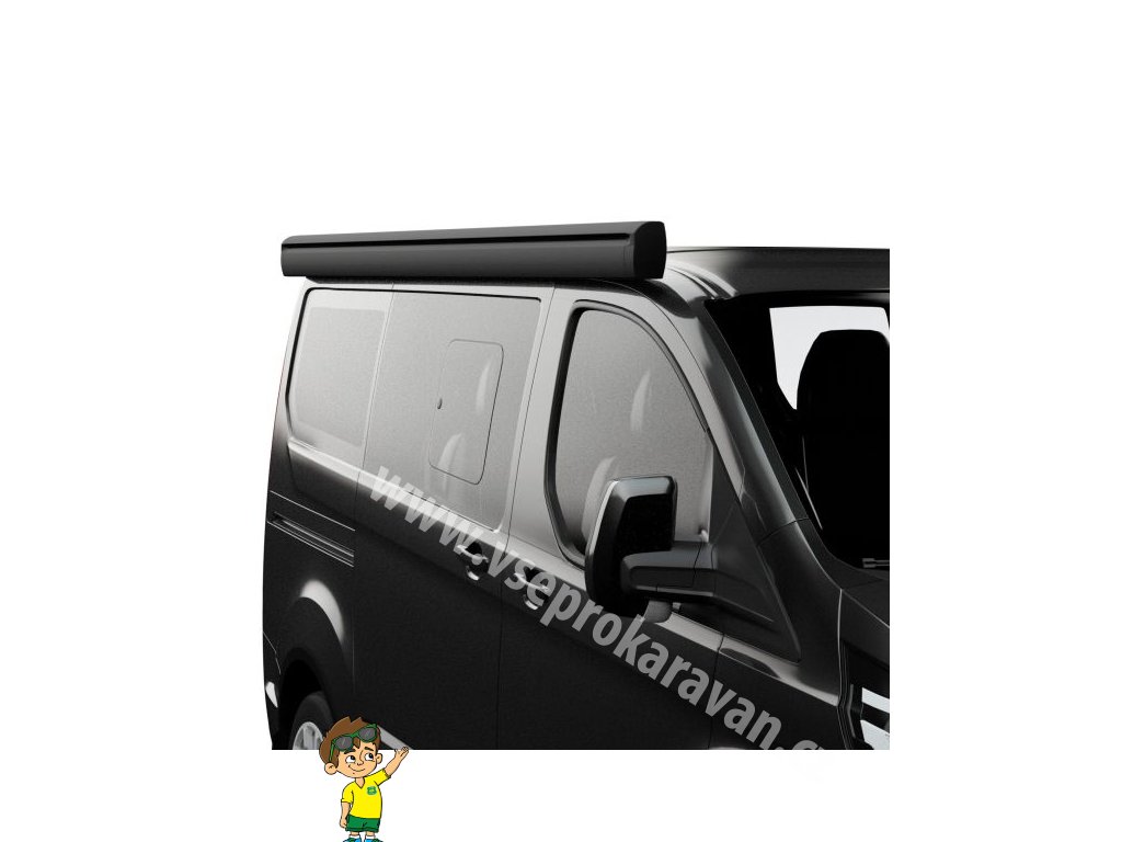 - Otevírání pomocí navijáku s magnetickou západkou v koncovce, pohodlná poloha díky montážní výšce markýzy na dodávce