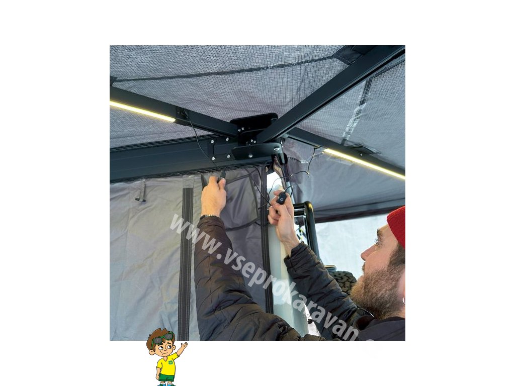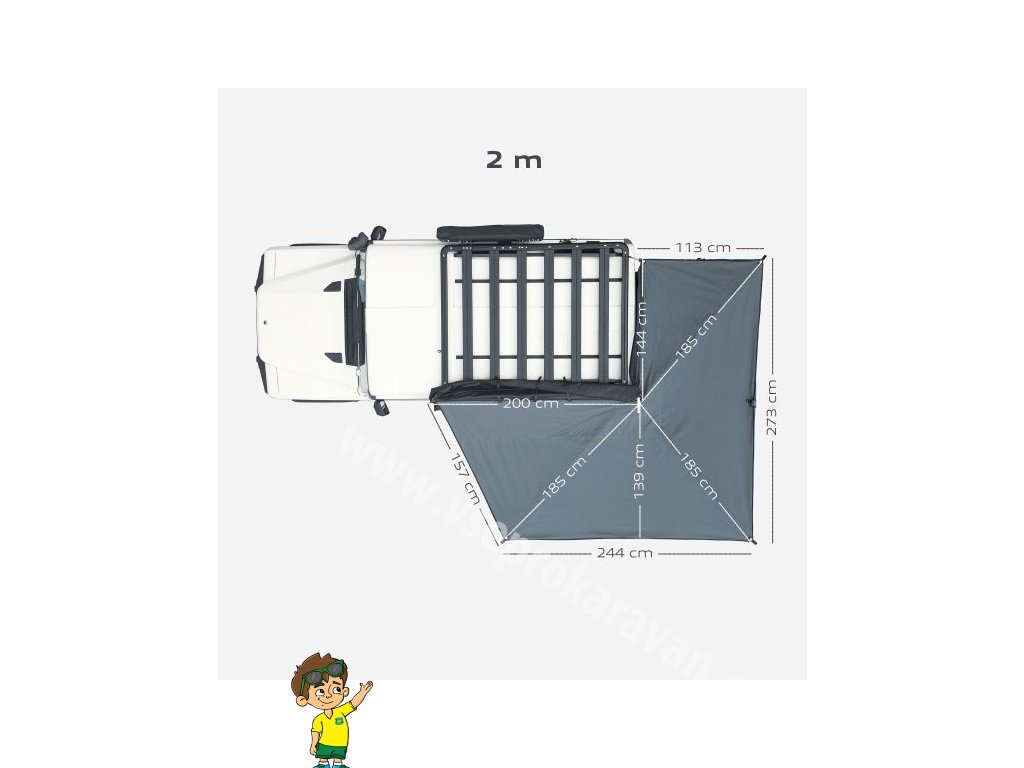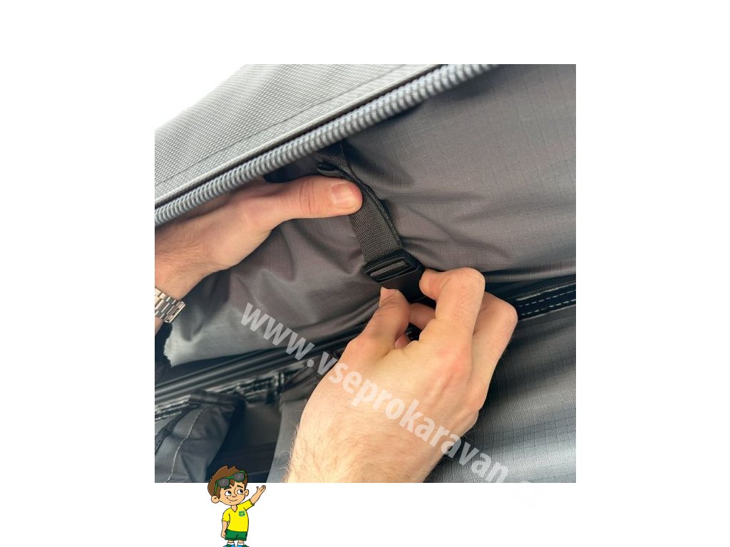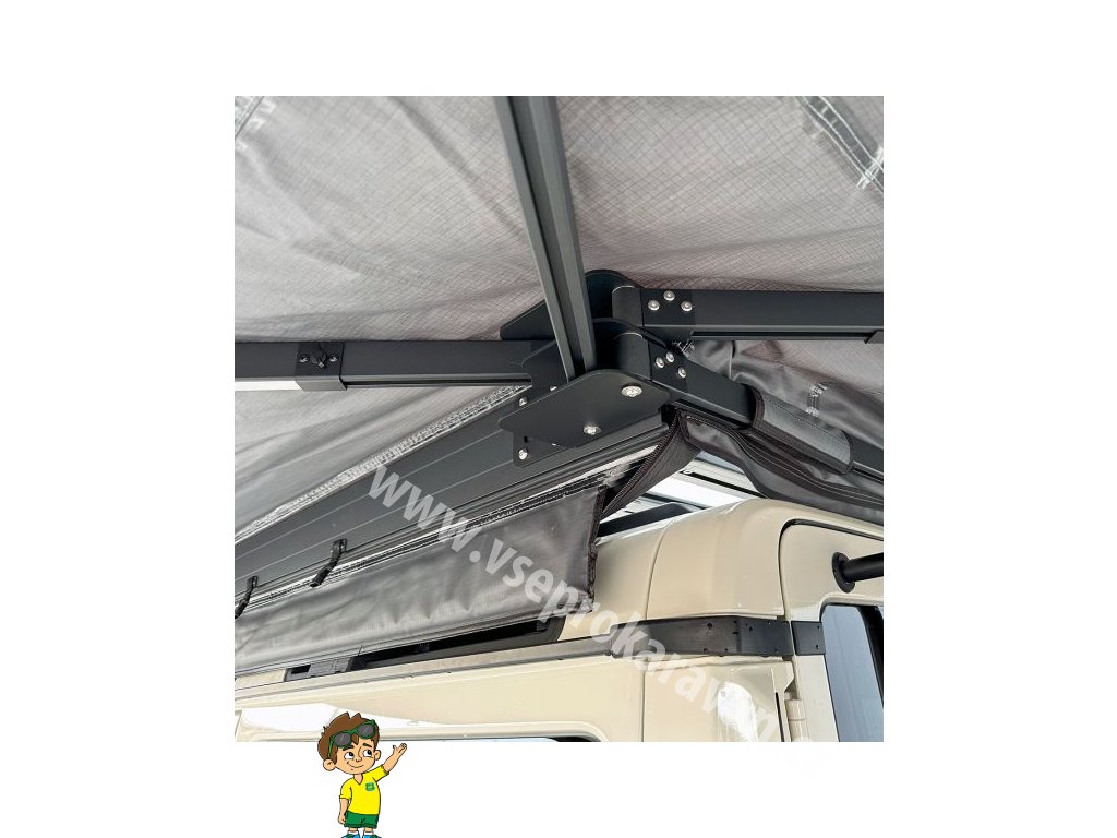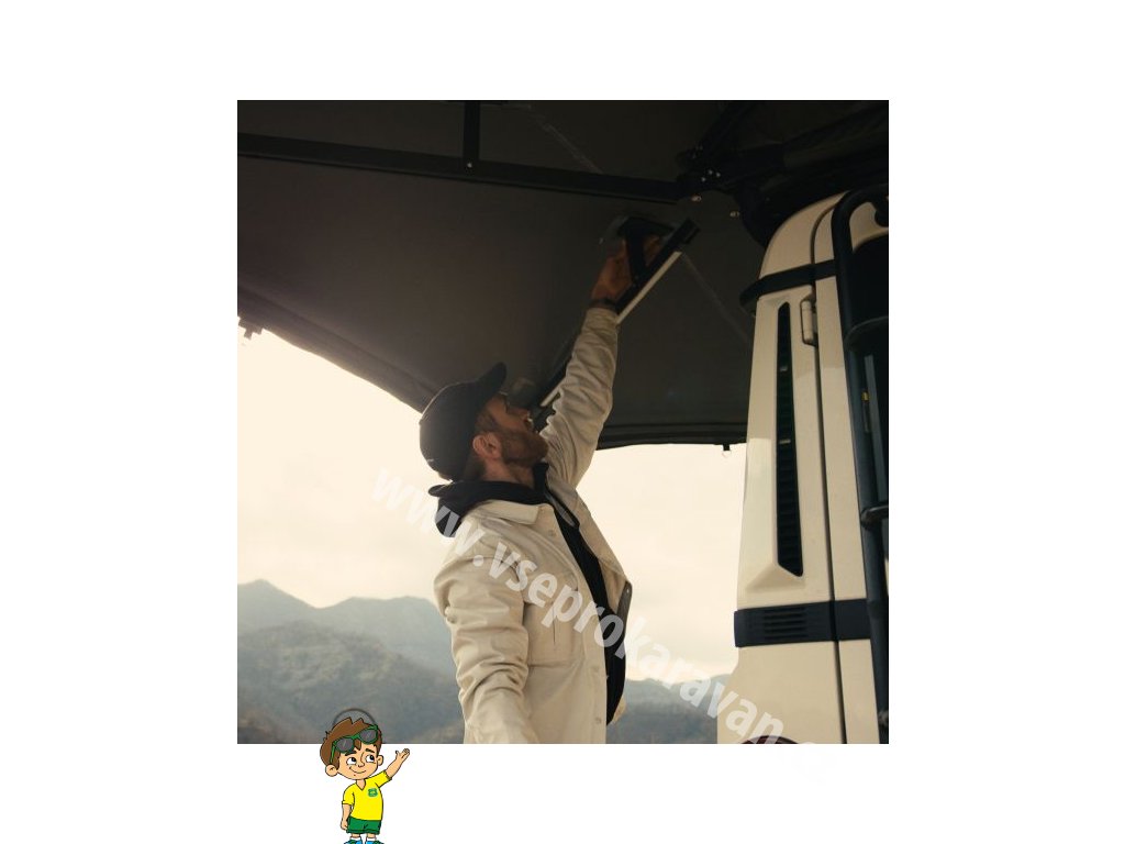 Markýza je vyrobena z odolné polybavlněné tkaniny o gramáži 280 g/m², která nabízí vodní sloupec 3000 mm a UV ochranu UPF 50+. Zesílené gumové prvky v namáhaných místech pomáhají odvádět vodu a zabraňují jejímu hromadění. Stabilita konstrukce je dimenzována na vítr až do 30 km/h v samonosném režimu, při použití teleskopických podpěr a kotevních lan pak až do 60 km/h. Samotná markýza zůstává lehká a snadno manipulovatelná – hmotnost činí 18,95 kg u varianty 2,0 m a 23,95 kg u varianty 2,5 m
