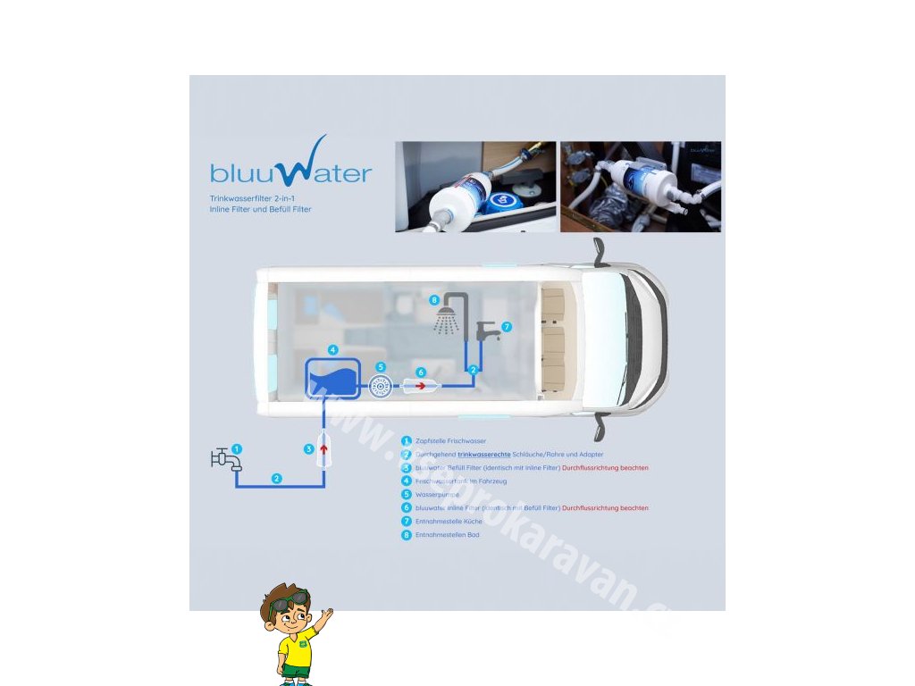 Filtr je nutné vyměnit nejpozději po 6 měsících. Instalace může být provedena svisle nebo vodorovně dle instalačního návodu. Je nezbytné používat vhodné rychlospojky. Od modelového roku 2022 bude spojovací systém s rychlospojkami v rekreačních vozidlech KNAUS Tabbert předinstalován z výroby.