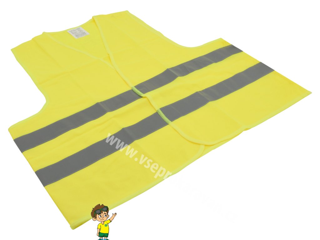 Výstražná reflexní vesta (ochranný oděv s vysokou viditelností) se zapínáním na suchý zip. Dva reflexní pruhy po celém obvodu, žlutá barva. Vesta se obleče na stávající oděv tak, aby žádná její část nebyla překryta jinými částmi oděvu a na přední straně se zapne pomocí suchého zipu.