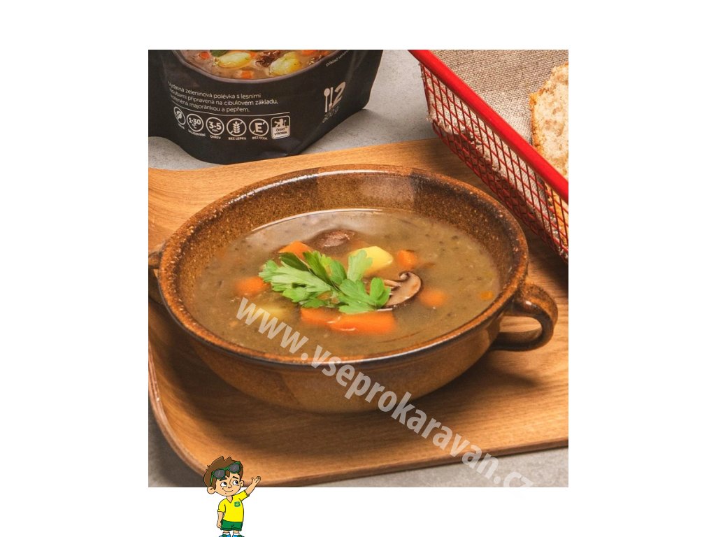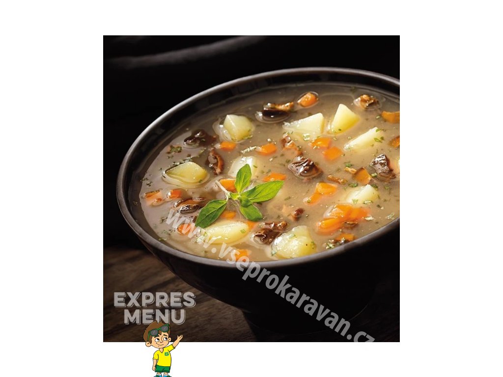 voda, brambory (8 %), směs polévkové zeleniny (mrkev, hrášek, květák, brokolice, kapusta, kedlubna), rýžová mouka, kukuřičná mouka, řepkový olej, cibule, sušené houby, česnek, sůl kamenná, majoránka, pepř, kmín.