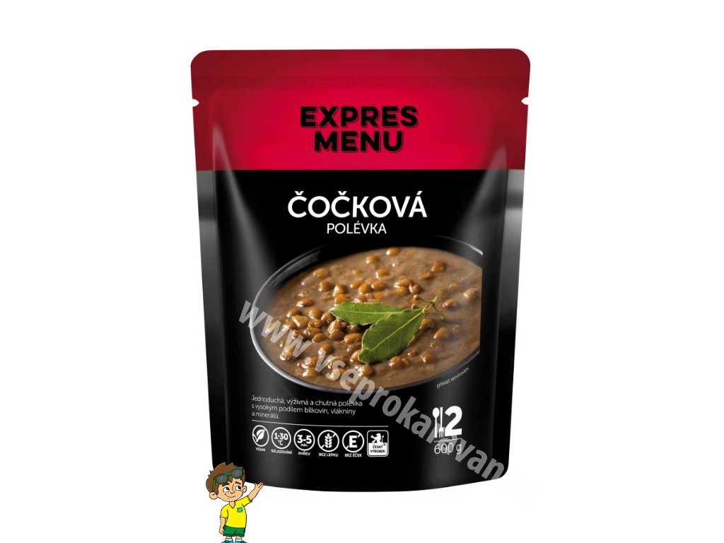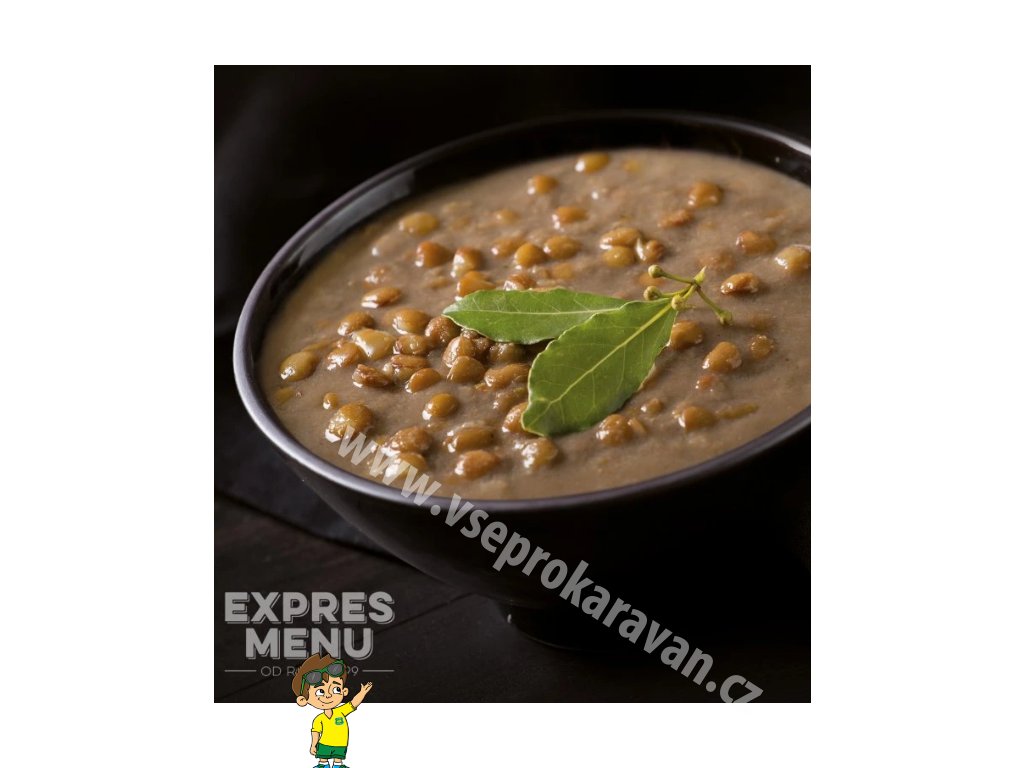 voda, čočka (23 %), řepkový olej, čočková mouka, cibule, česnek, sůl kamenná, majoránka, pepř.