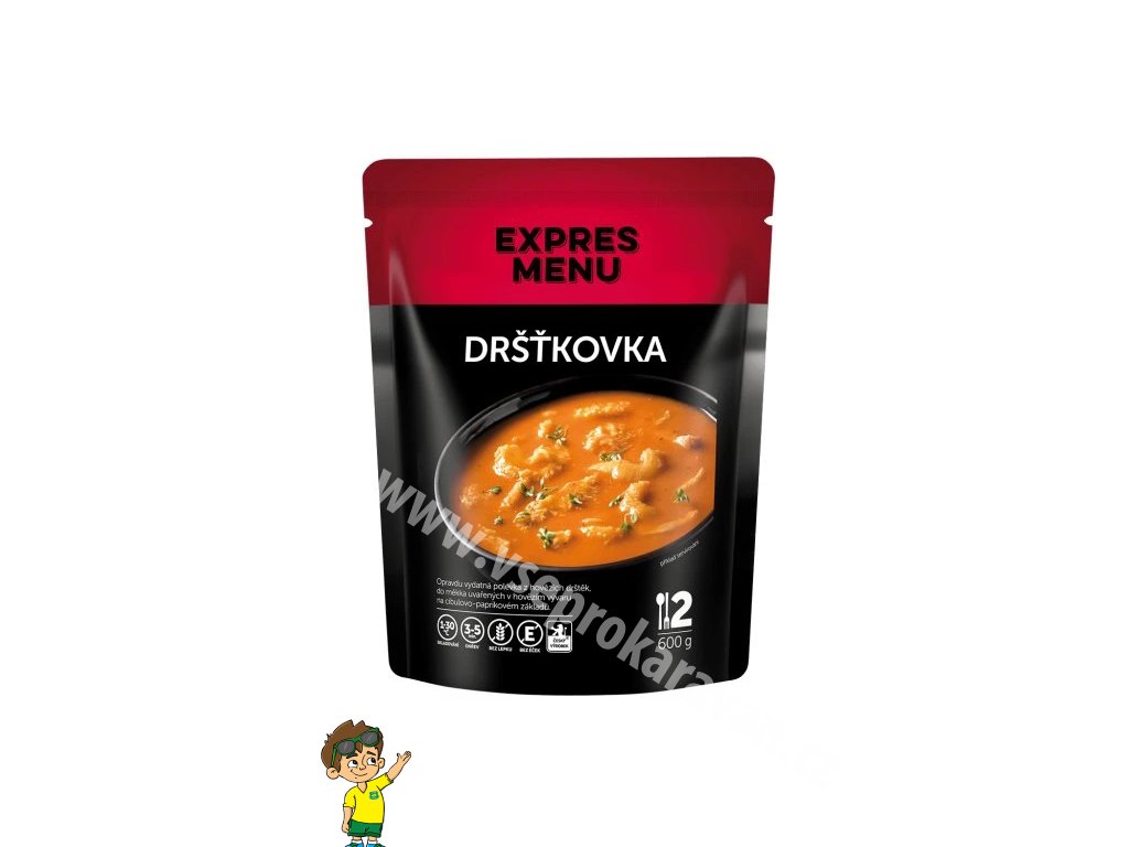 hovězí vývar (voda, hovězí maso a kosti), hovězí žaludky (26 %), cibule, rýžová mouka, kukuřičná mouka, řepkový olej, paprika, sůl kamenná, česnek, pepř, kmín, majoránka.