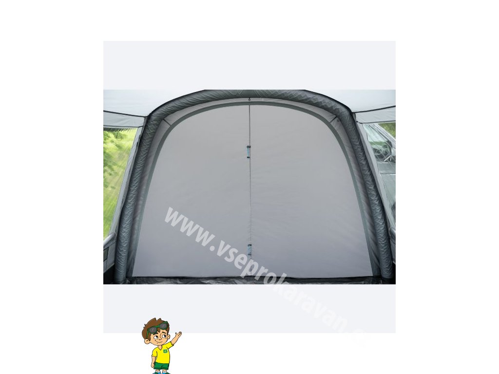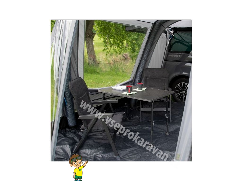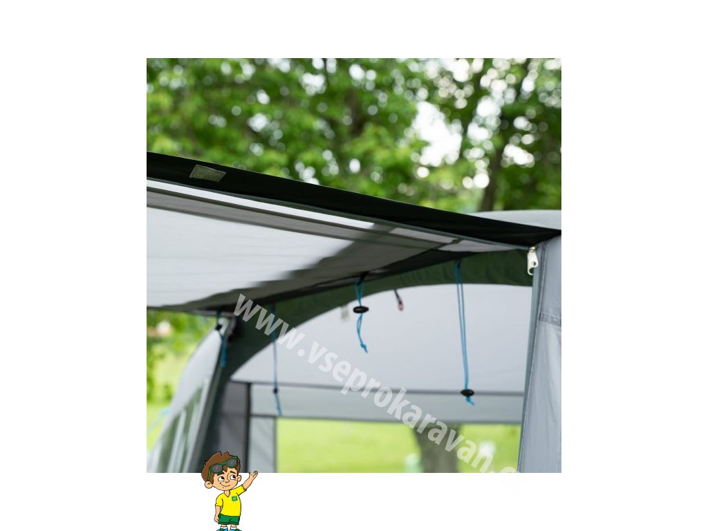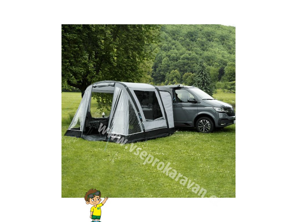 - Stan je volně stojící a k vozidlu se připojuje pomocí tunelu, který se dokupuje samostatně podle výšky střechy dodávky nebo obytného auta.