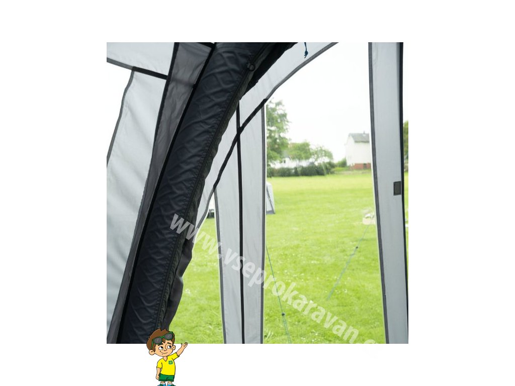 - Přední dveře s panoramatickým oknem lze srolovat, nebo je napnout a pomocí stavěcích tyčí z nich vytvořit stříšku nad vchodem stanu.