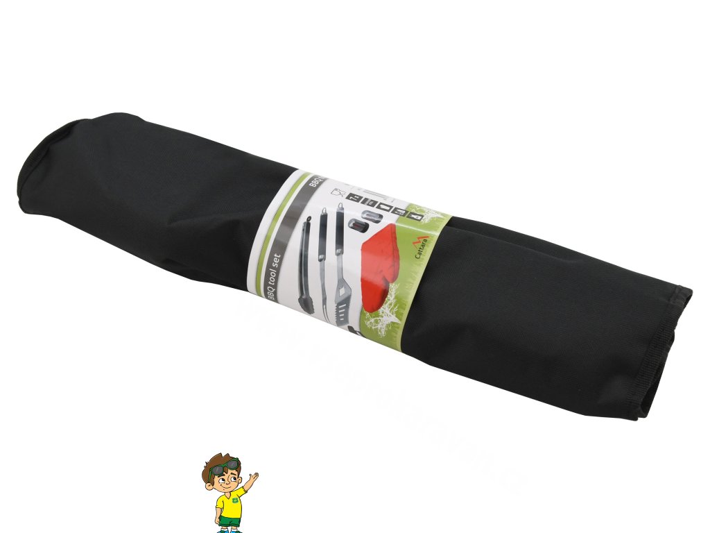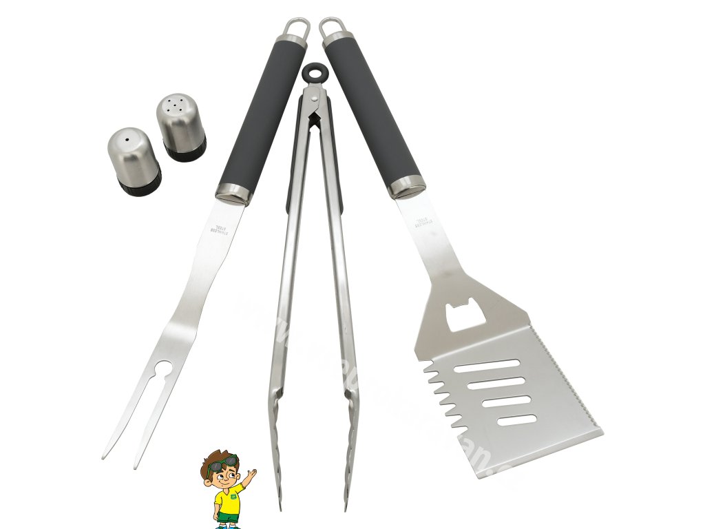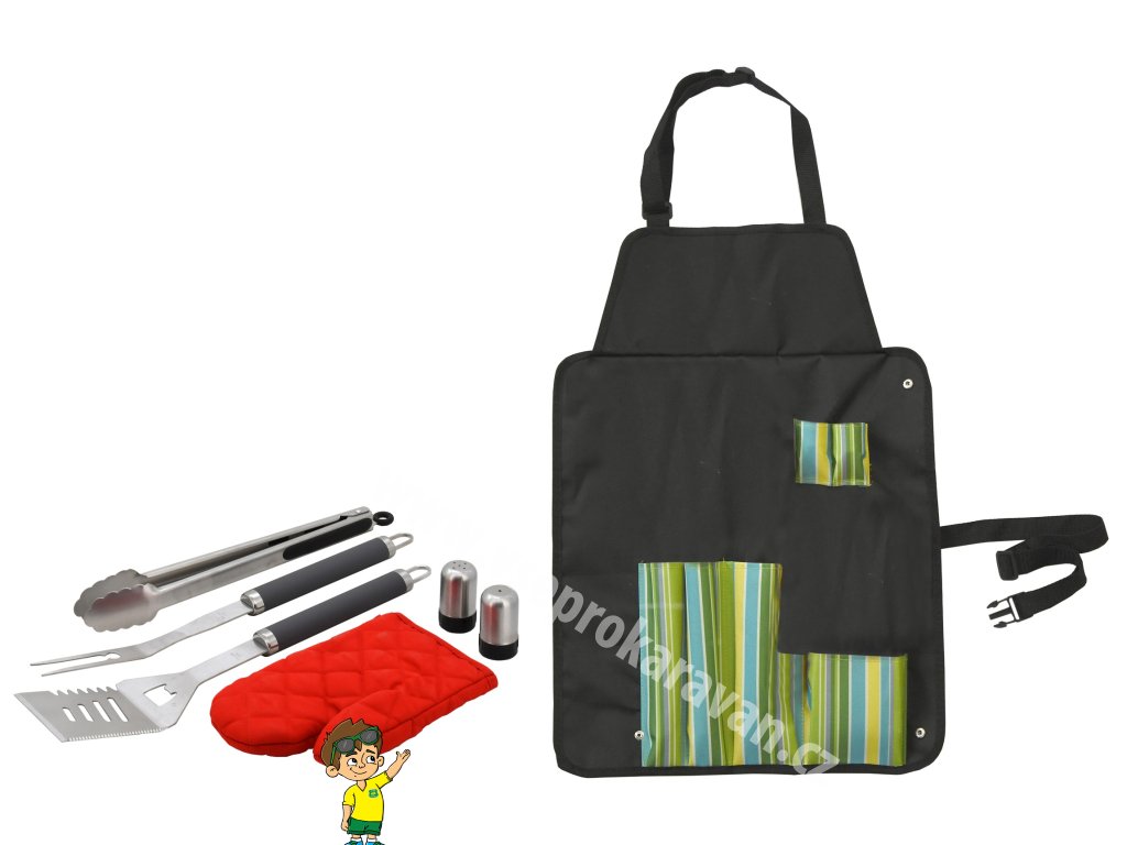 Sada nářadí a zástěry pro grilování, skládající se ze zástěry opatřené kapsami a slánkou, s pepřenkou, rukavicí a klasickými nástroji jako obracečka, vidlička a kleště. Kleště jsou opatřeny zoubkováním pro jisté uchycení mastných pokrmů a mají délku 40 cm. Dvouzubá vidlička s délkou 44 cm. Obracečka délky 43,5 cm s precizně zabroušenou hranou, zoubkováním a odtokovými otvory pro otáčení masitých ale i jiných pokrmů. Jednotlivé nářadí je kvalitně zhotoveno z nerezové oceli, není nijak zbytečně tvarováno, což významně usnadňuje čištění. Rukojeti jednotlivých nástrojů jsou silikonové a výborně padnou do ruky. Všechny nástroje lze navíc zavěsit na háček.