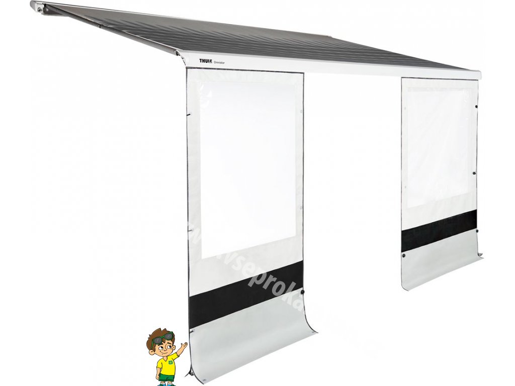 Thule jsou odolné proti větru a mají velká okna. Jsou namontovány svisle a zakrývají odpovídající oblast až k podlaze. S velkým oknem z nepromokavého uzavřeného PVC. Je vtažen do předního panelu a připevněn k podlaze. K kompaktní přední straně a také přímo k bočnímu panelu Rain-Blocker lze připojit různé délky a vytvořit tak pod markýzou soukromější oblast chráněnou před větrem. Cena je za 1 kus stěny - v balení je vždy pouze jeden díl.