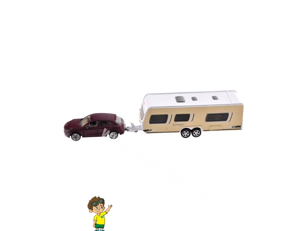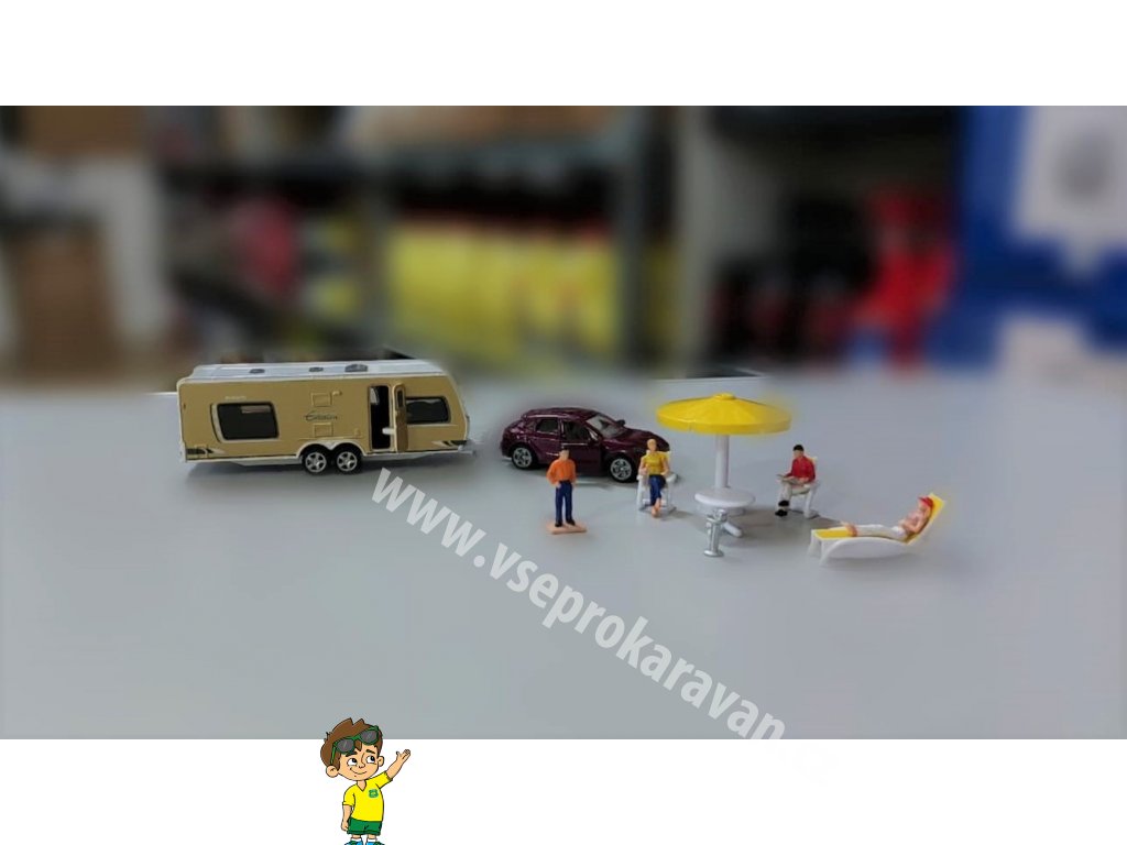 - Auto společně s karavanem, Dethleffs "Exclusiv Emotion" a spousta příslušenství ze série SIKU SUPER. Odnímatelná střecha karavanu je obzvláště zvláštní. To také umožňuje hrát si s dodanými figurkami uvnitř karavanu. Kromě figurek jsou zde také 2 zahradní židle, kulatý stůl, slunečník, zahradní lehátko a malý gril.