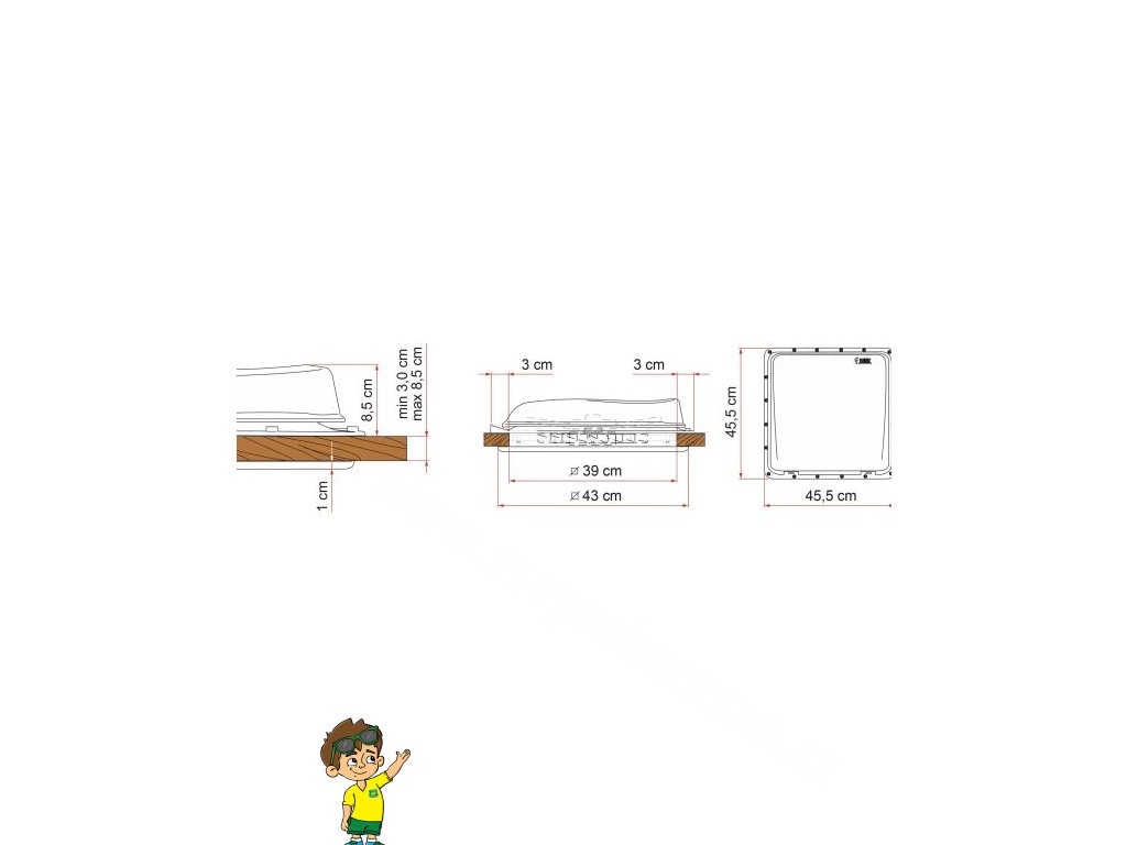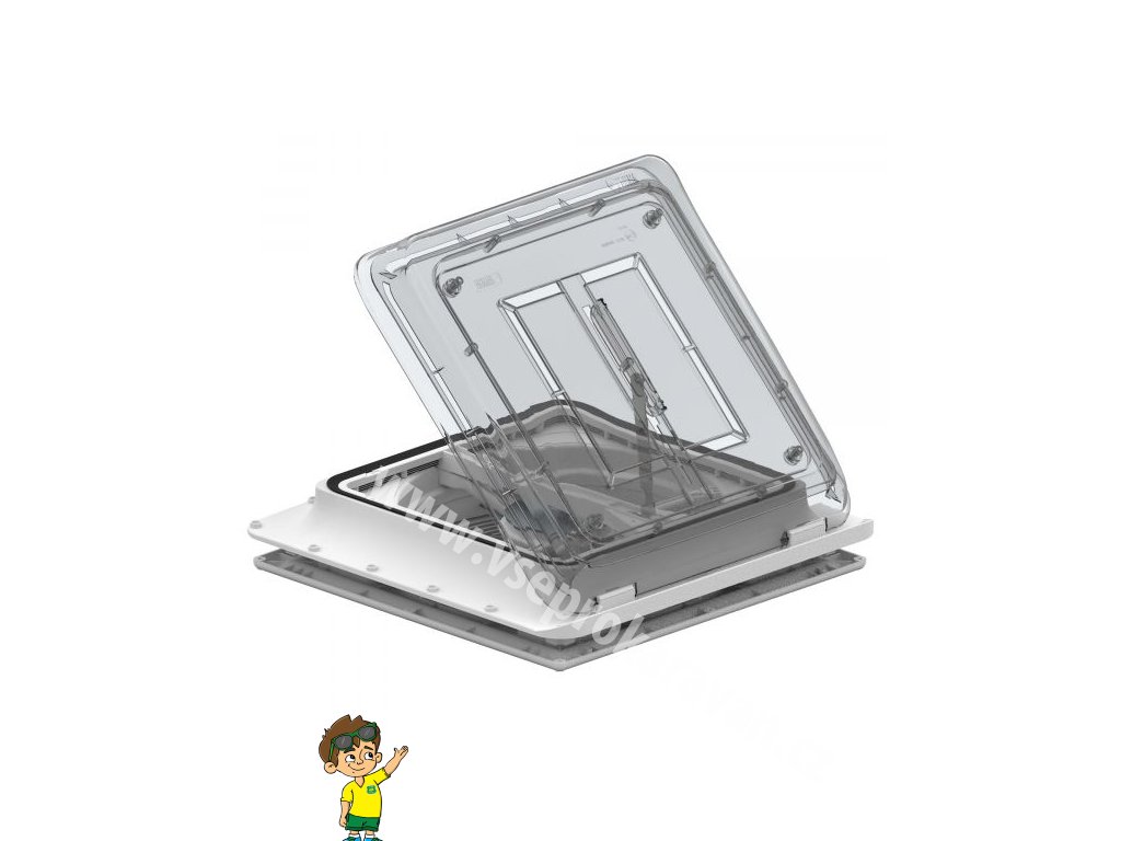 V okně je napevno instalována síťka proti hmyzu, otevírá se pomocí otočného ovládání, díky němuž je možné nastavit míru otevření. Součástí okna nejsou šrouby pro montáž. Okno vhodné k instalaci na karavany nebo obytná auta s kompletně rovnou střechou.