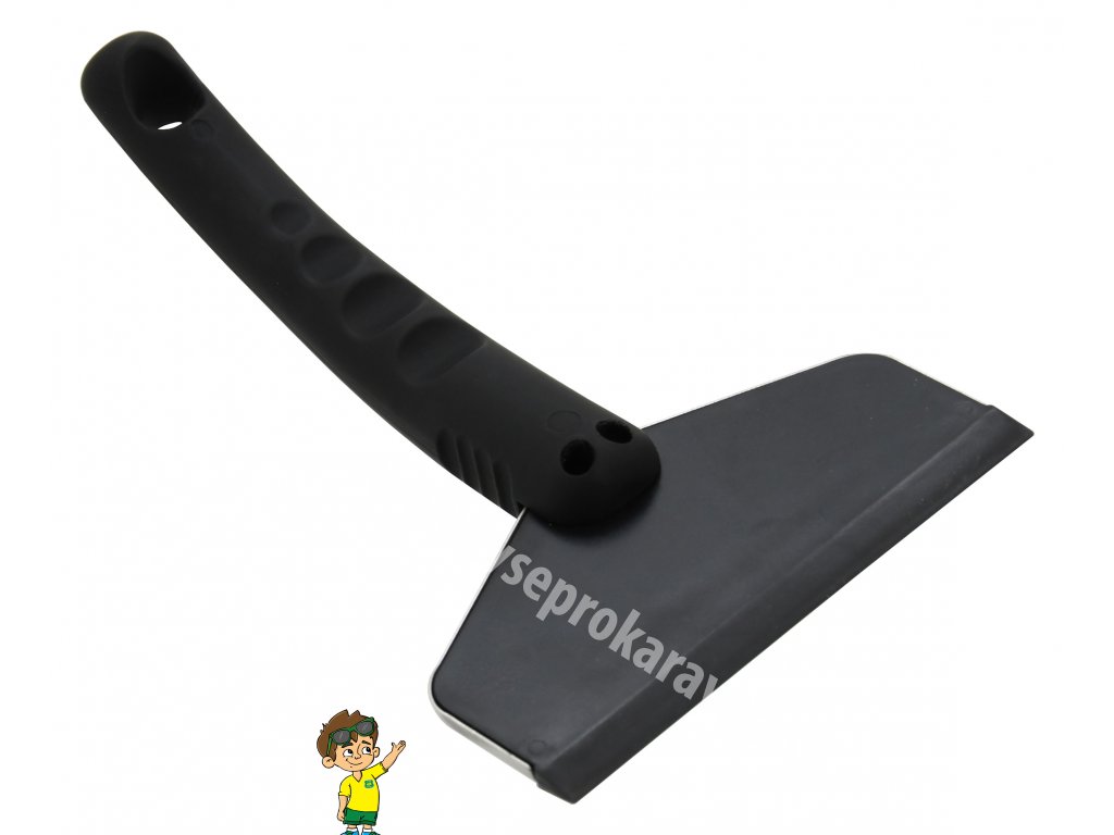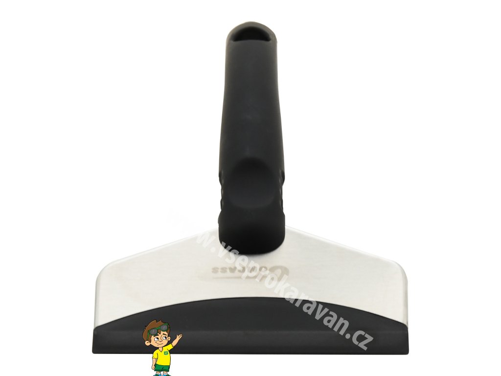 Stylová škrabka s ergonomickou rukojetí a kovovými doplňky, délky 18 cm. Břit je zhotoven z vysoce odolného, měkkého plastu pro bezpečné použití bez poškození skel. Šířka břitu 11 cm zabezpečí rychlé a šetrné očištění skel.
